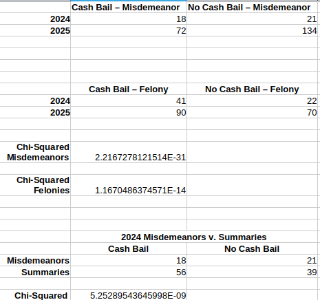 Data was recorded in a spreadsheet (LibreOffice Calc, version 24.7.2, running on Ubuntu Linux). For each case we recorded the Offense Tracking Number (OTN), the offense grade of the most serious charge (Summary, Misdemeanor, Felony, or Homicide), whether or not cash bail was imposed, and the number of days from arraignment to preliminary hearing. The OTN was included so that we could go back and get more data from each case, should that become desirable. In addition, we kept a running tally of charges, recording the name of the offense, its grade and subgrade (2nd degree misdemeanor, 3rd degree felony, etc.), and updating the tally as new cases containing the charge were found. The flaw in the running tally approach is that it doesn’t allow calculation of the standard deviation of charges/case, making it impossible to determine the statistical significance of between-sample variation in this ratio. This oversight will be rectified in an upcoming followup study. In other comparisons, statistical significance was assessed with a Chi-Squared test or a two-tailed t test as appropriate.