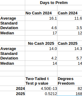 One would expect such a massive crackdown on petty crime to stretch the resources of Pittsburgh Municipal Court. The PBP is by far the largest police department in the county, and they can hardly start dumping twice their usual numbers of defendants into magisterial district courts without straining the system to some degree. Regardless, it would appear that the disruption, at PMC at least, has been fairly minimal. In October 2024 defendants had their preliminary hearings scheduled an average of 13.4 days after arraignment. In October 2025 that stretched only to 14.2 days, a fairly negligible delay. Breaking down the numbers a little further is revealing, however. Examining the time to prelim when cash bail had been imposed for October 2024 shows an average of about 11.5 days, versus over 16 days when the defendant was released without payment (a difference calculated to be statistically significant with over 99% confidence). This discrepancy just maybe means that magistrate judges were prioritizing defendants stuck in jail in an attempt to move their cases through the system a little faster. In October 2025 there was virtually no difference between the two groups, with both clocking in at about 14 days (14.0 to 14.3, a statistically and functionally insignificant gap). One possible explanation for the change is that judges who might in the past have reserved some earlier slots in their schedules for incarcerated defendants are now simply scheduling everyone for the next available opening. This practice would eliminate wasted slots when fewer jailed defendants appear than expected, at the expense of making those folks languish inside longer.